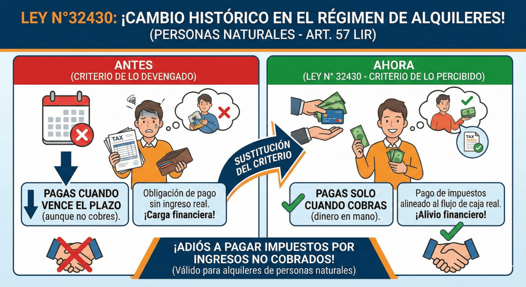 La ley N°32430 modifica el Articulo 57 de la Ley del Impuesto a la renta, estableciendo el cambio más significativo en el régimen de alquileres para personas naturales en la última década. Sustituye el criterio de «Lo Devengado» (pagar cuando vence el plazo) por el criterio de «Lo Percibido» (pagar cuando se cobra).
