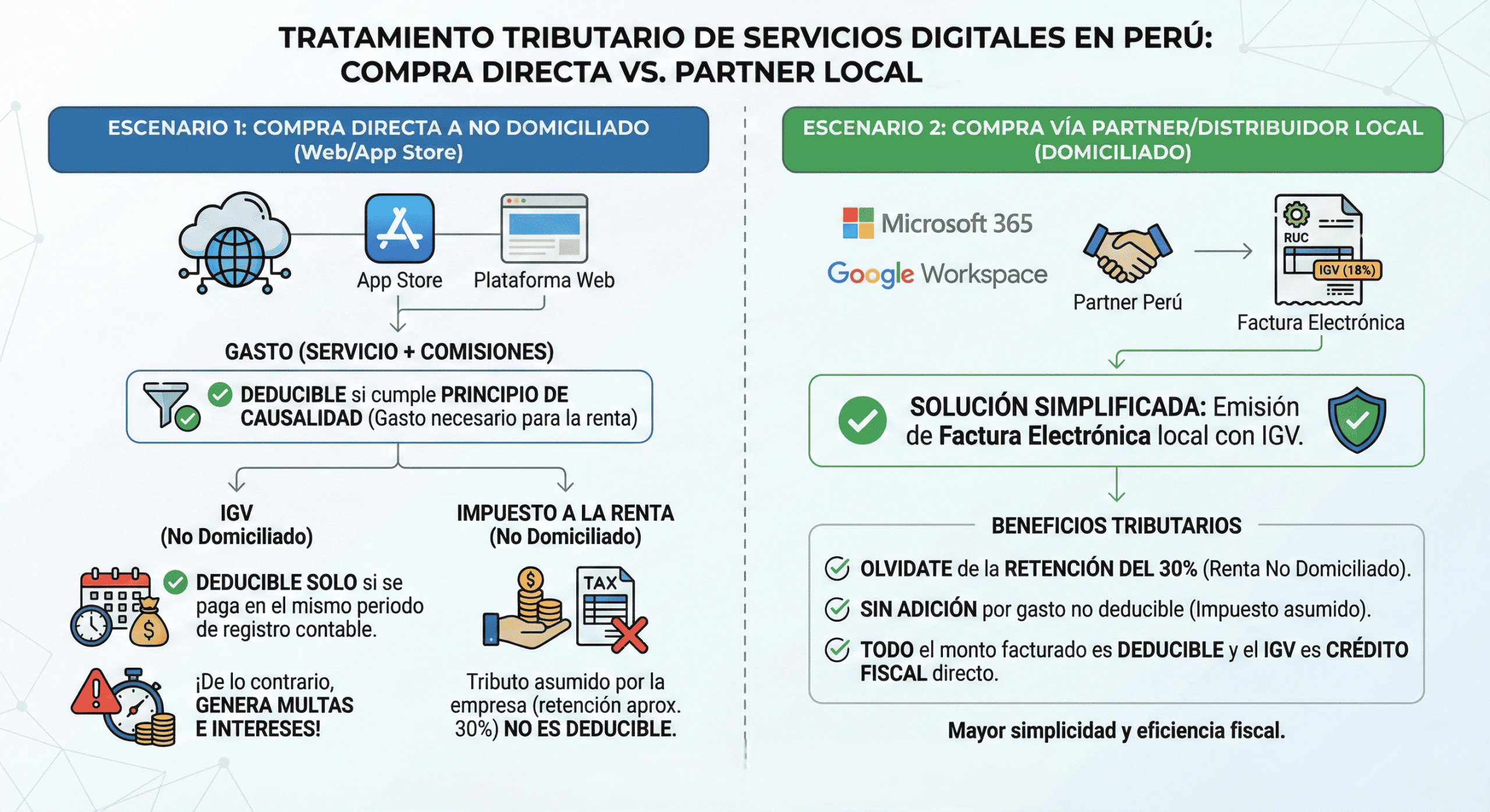 Una posible solución para algunos casos de los servicios digitales es adquirir las licencias o servicios como por ejemplo de Microsoft 365, Google Workspace y otros, a través de un partner o distribuidor domiciliado en Perú. El distribuidor peruano emitirá una Factura Electrónica local con IGV (18%). Al ser una compra local, la empresa se olvida de la retención del 30% y de la adición por gasto no deducible. Todo el monto facturado es deducible y el IGV es crédito fiscal directo